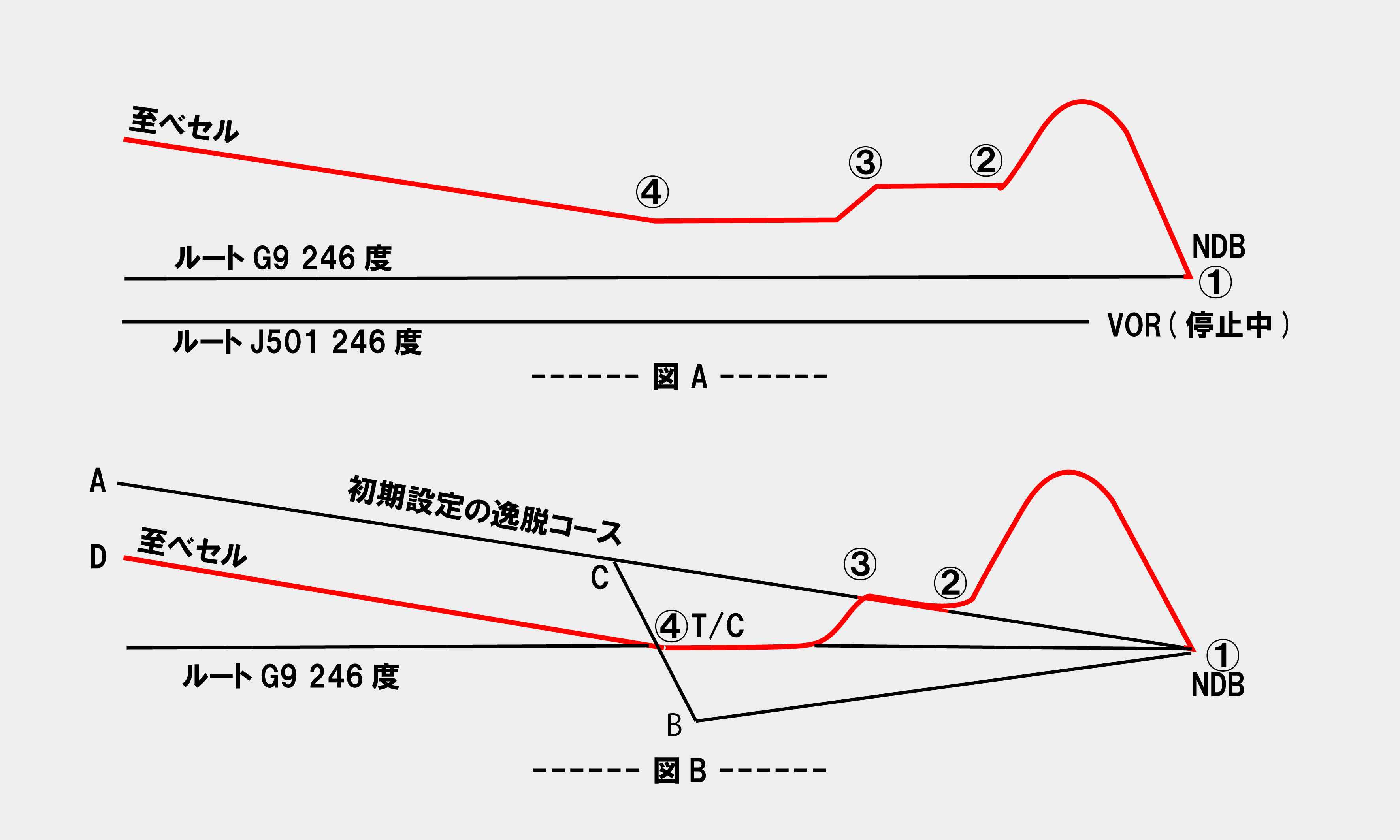 図-A は著書(撃墜)に載っているレーダーによる航跡であります、この図において ①-② の区間は離陸後タワーの指示により飛行した航跡であり説明を加える必要はありませんが ②-③-④ とそれ以降の区間についての航跡の意図するものを考察する必要があります。