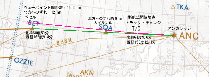 この逸脱コースにて飛行しベセルでの誤差距離(正しいベセルと逸脱したベセル間の距離)は DME 13.5 ノーチカルマイルとなり、北方へのずれは INS 11.8 ノーチカルマイルとなりました。